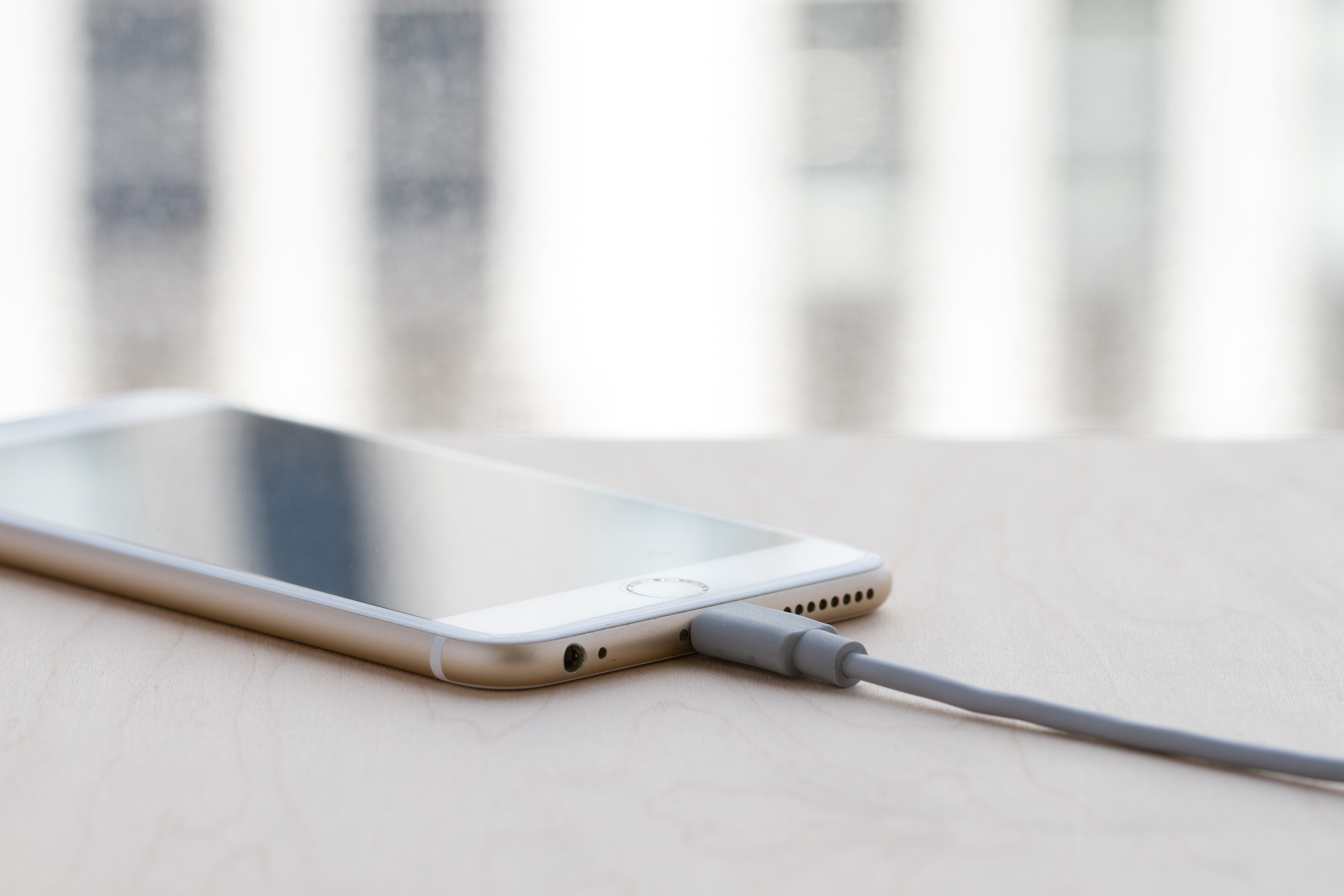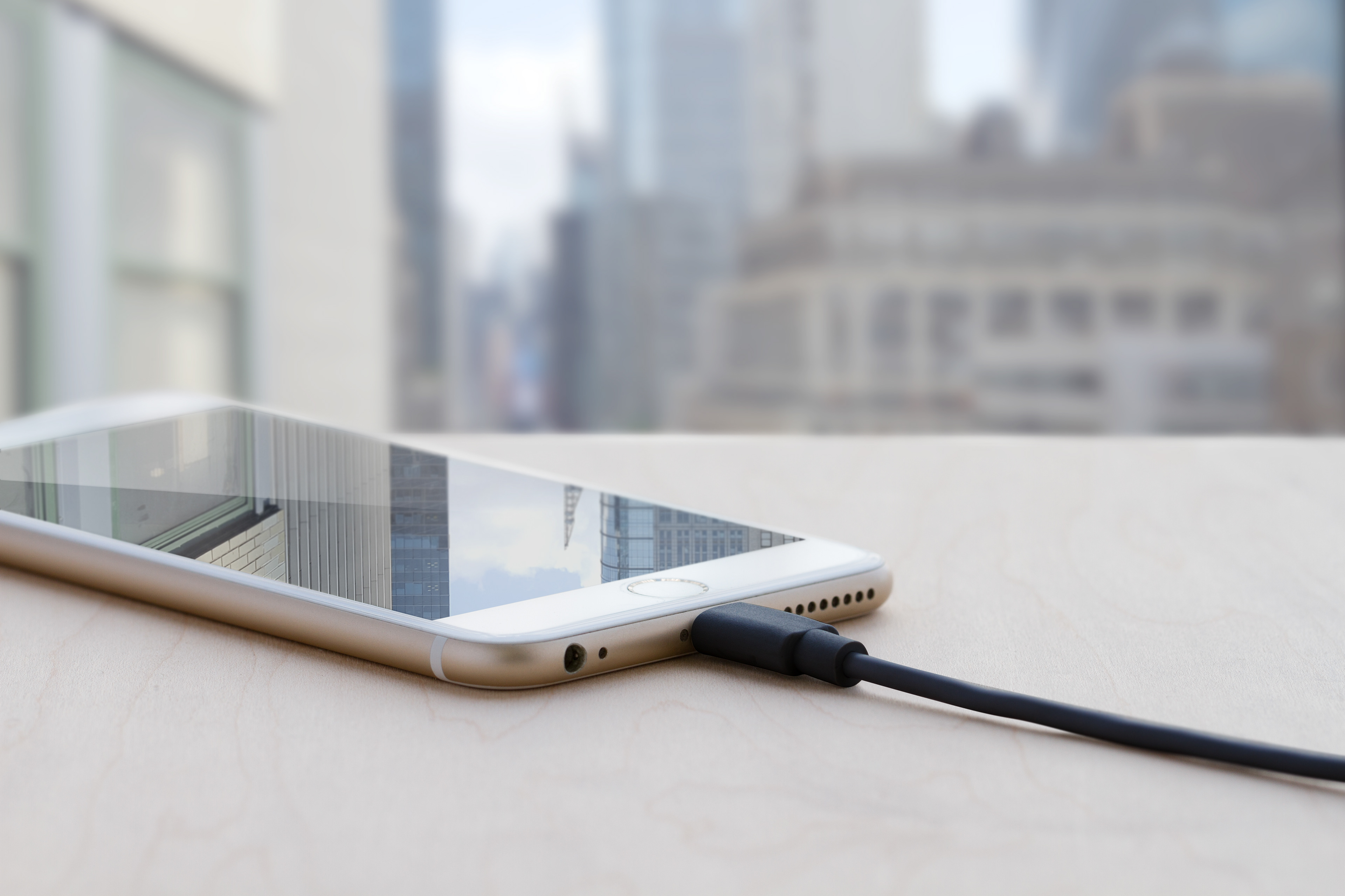 Before and After: iPhone charging on wood surface near city window